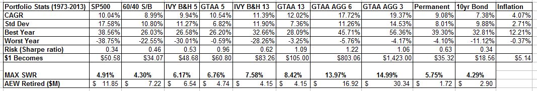 Here are the summary stats for the various portfolios from 1973 to 2013.