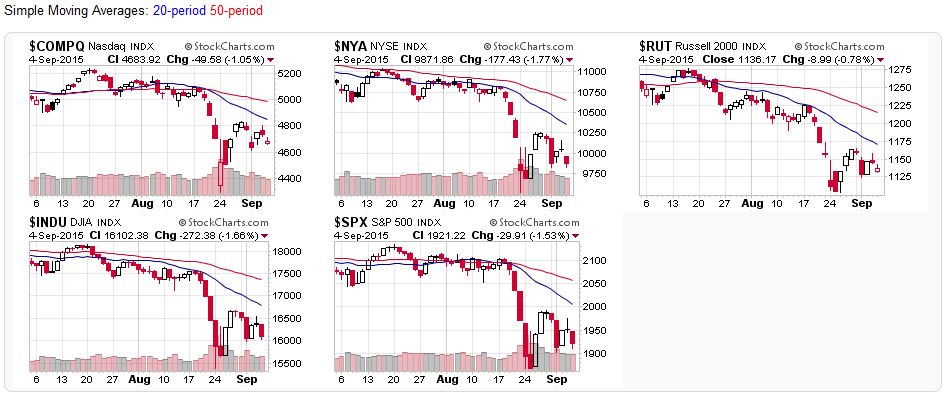 Speaking of trading, the information here just gives you an idea of the general market conditions. Obviously, you can’t use these posts to day trade, or even “week” trade. Moving averages smooth out price movements. Since the US markets declined so rapidly, the prices that make up a moving average are still dominated by price levels before the decline. So I expect the next rally to occur without an immediate change in the market outlook.