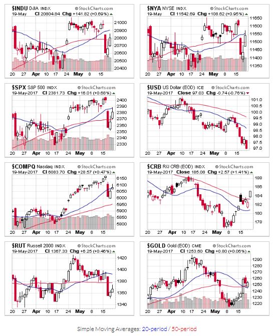 Stock indexes recovered some of their losses, and most begin this week above their 50 day moving averages, but below their 20-day. The Russell 2000 sits below both levels, reflecting the difficult week for small cap stocks.