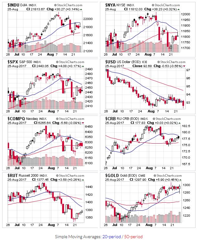 All the indexes begin this week under their 20 day moving averages. Aside from the DJIA, they’re all under their 50 day moving average as well. The Russell 2000 remains in bear market territory, starting the week below its 200 day moving average.