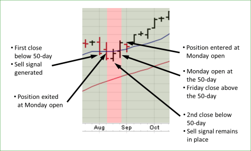 False signals are a risk that goes hand in hand with mechanical trading systems. Ideally, your system will be reactive enough to protect your capital from large downtrends, but passive enough to overlook small downtrends and let your gains run. Unfortunately, every large downtrend starts off as a small one, and you’ll only know which in hindsight.