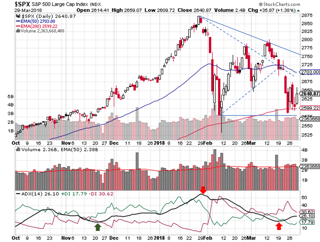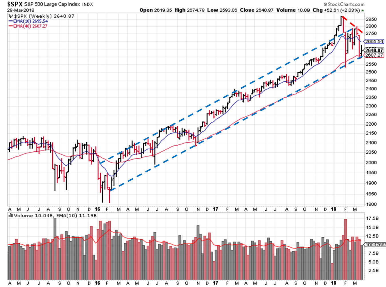 Taking a longer-term look, you can see the S&P500 break the upper channel of a long term trend as we started 2018. This is typically a sell signal, or at the very least an indication that it’s time to take some profits. True to form, the markets sold off, and are now testing the lower channel. On the plus side, the index found support at the lower level 3 times this year, which indicates strong support at those prices. On the downside, last week’s test came on lower than average volume. Think of this as another data point on the current market conditions as you consider your investing strategy.