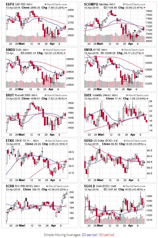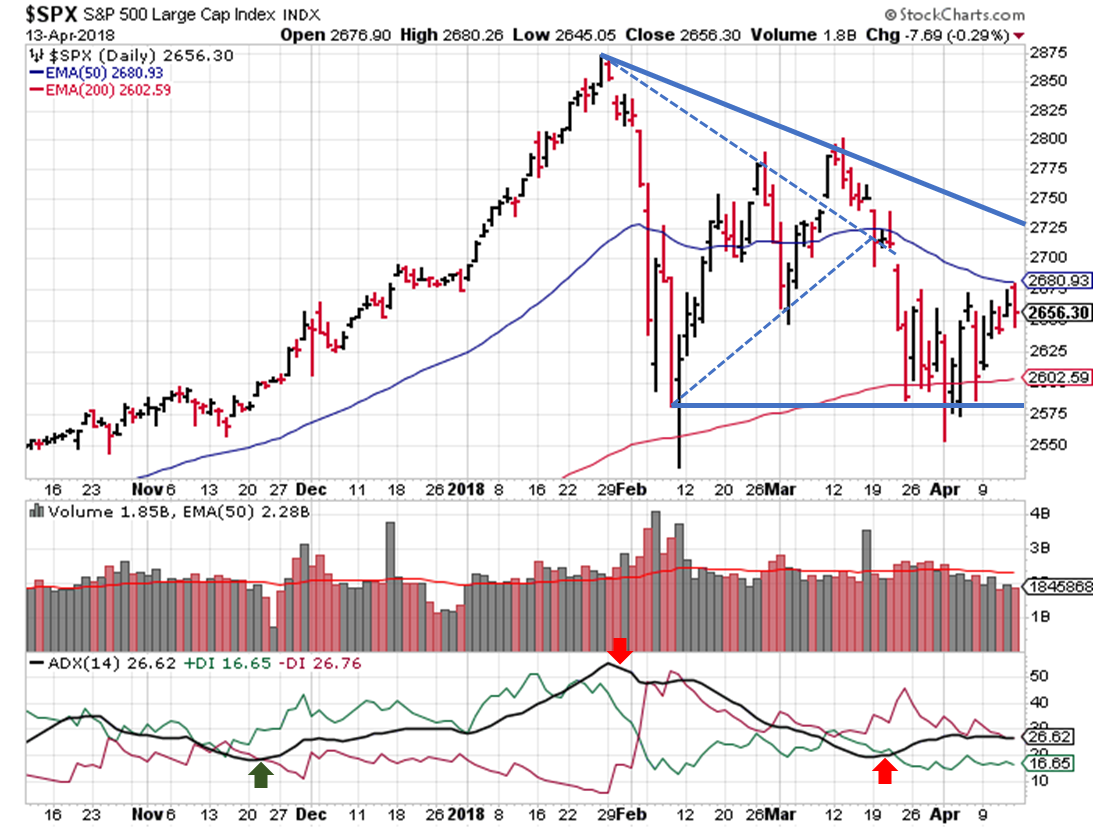 U.S. markets contended with the threat of an escalation in the Syrian War last week. As of Saturday, threats of missile strikes turned into actual missile strikes. We’ll see how markets respond on Monday. For now, we’re still in a downtrend, but price action did improve last week.