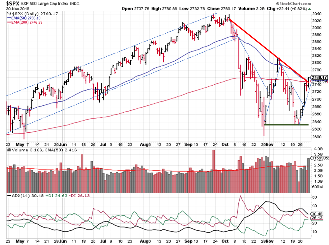 A change in language from Fed chair Powell put big investors back in buy mode, and the market rallied from there. At the G-20 summit this weekend, the U.S. and China agreed to start negotiations and ease trade tensions, with the U.S. postponing plans to increase tariffs on Chinese goods. A solid week of trading, the perception of a more accommodating Fed, and a temporary reprieve from tariffs puts the markets back in an uptrend, just in time for the annual Santa Claus rally.