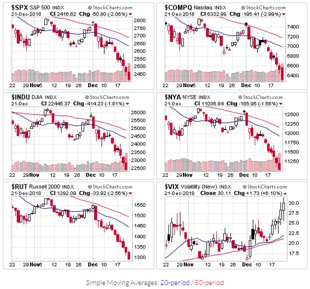 On to some trendlines. Sadly, there was no bounce back to the recent trading range, nor was there a floor of support from early 2018. The S&P ($SPX) fell to prices we haven’t seen in over a year (August 2017). Now we need to go back almost 2 years to see where we might bottom…elevator indeed.