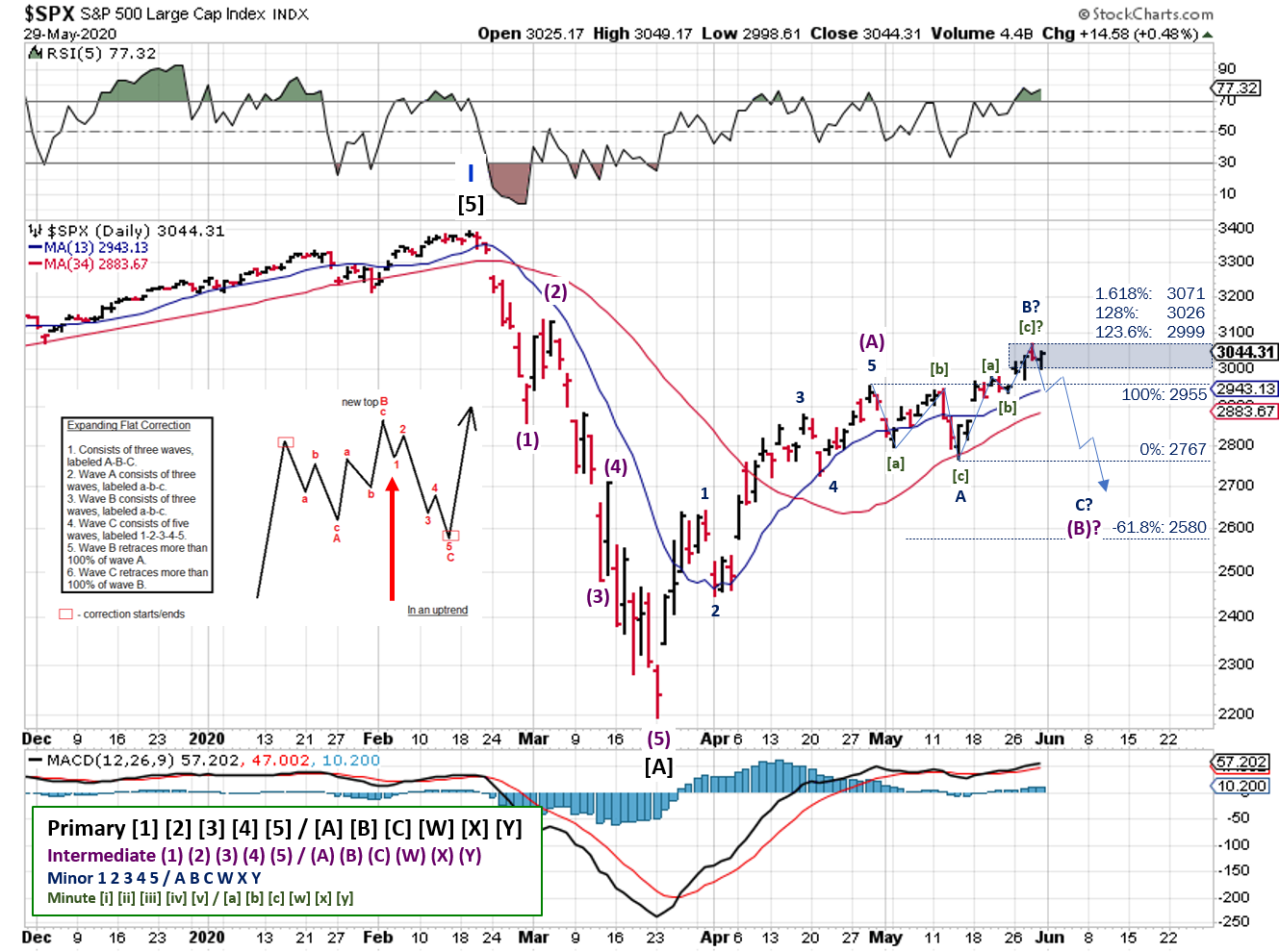 Of course, we can’t predict what the stock market will do; a price above 3071 this week and we’ll need to adjust the pattern and targets. It’s also possible for a double of triple three pattern to emerge, which would stretch out the Intermediate B wave over the summer.