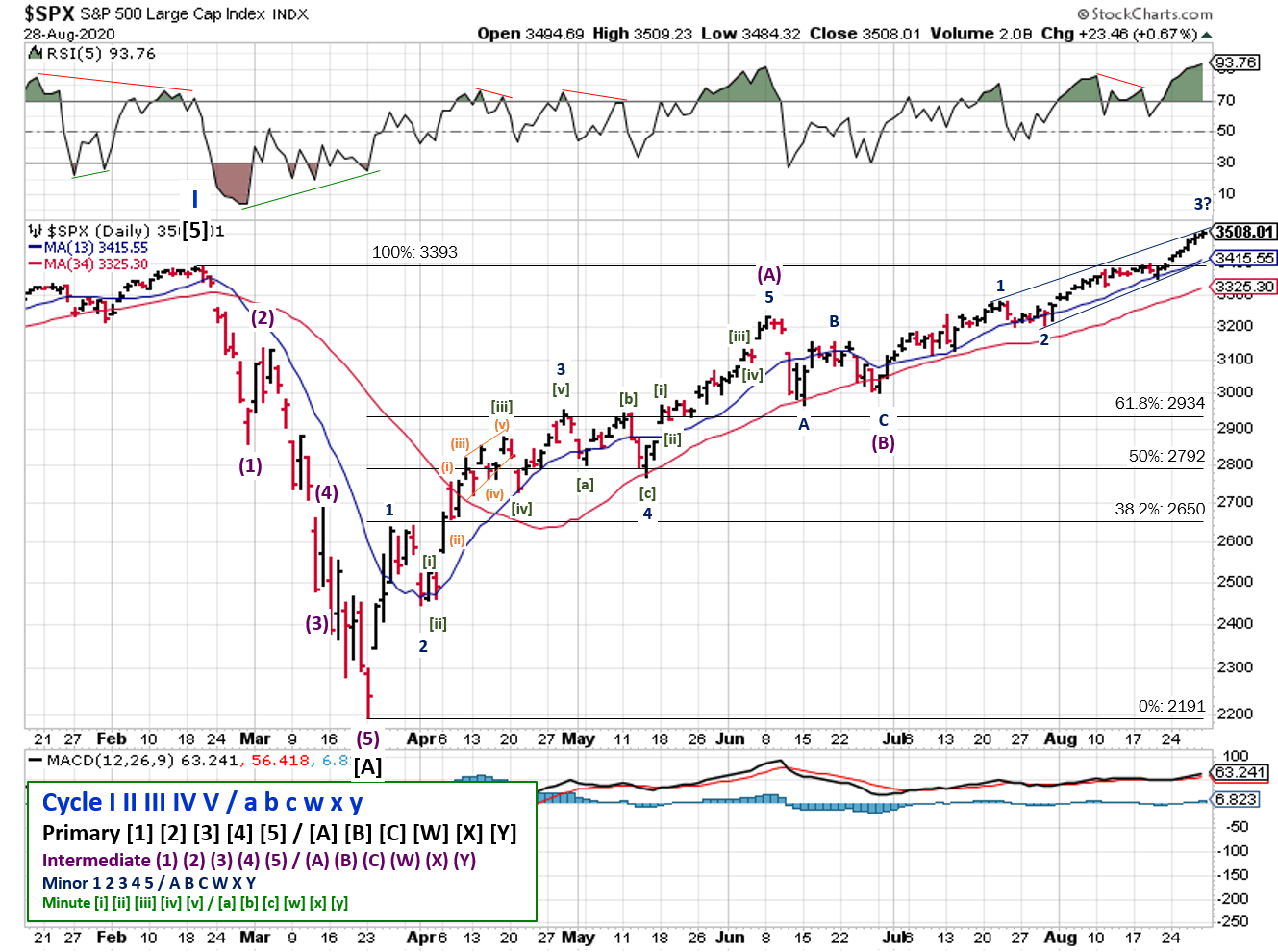The ADX shows a strong bullish trend in place, and price/volume action has also been bullish. The “correct” Elliott Wave count isn’t clear (to me at least). I adjusted the wave labeling, but all I really know is that it hasn’t turned bearish yet, so it’s still risk on.