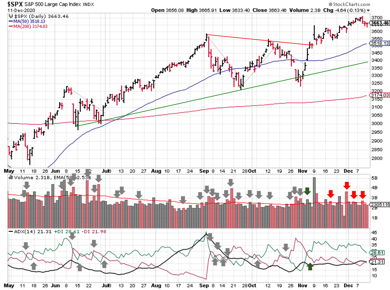 The S&P500 ($SPX) is still extended from the 200-day moving average (~13%). But uptrend signals remain in place for both ADX directional indicators and price/volume action.