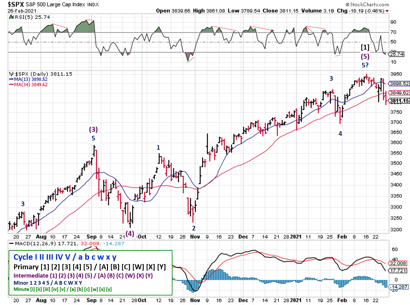 For Elliott Wave, the S&P wasn’t able to find support at the 13 or 34 day moving averages. It’s possible a 5th wave just ended, which would mean it’s time for a correction. The size of that correction depends on whether you think we’re in a bull or bear market and how long we’ve been in it (i.e. which 5th wave just ended – Cycle, Primary, Intermediate, Minor…or was is a B-wave).