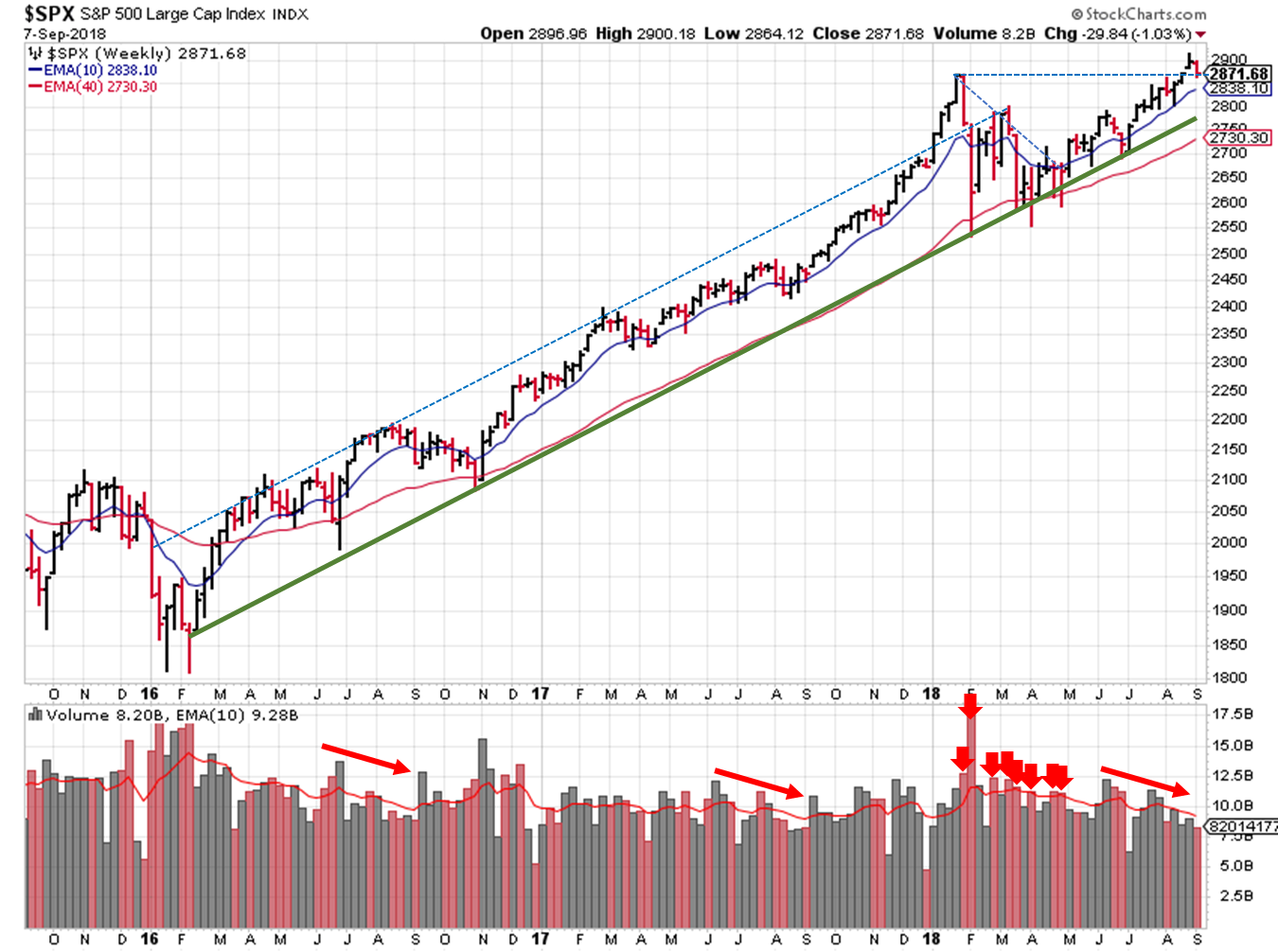 The downtrend remains from a price/volume perspective, as leading stocks continue to get trounced and prices continue to fall on higher than average trading volume.